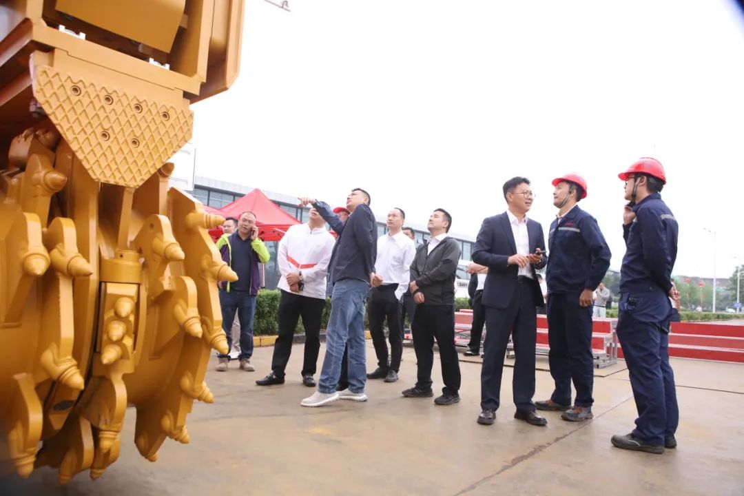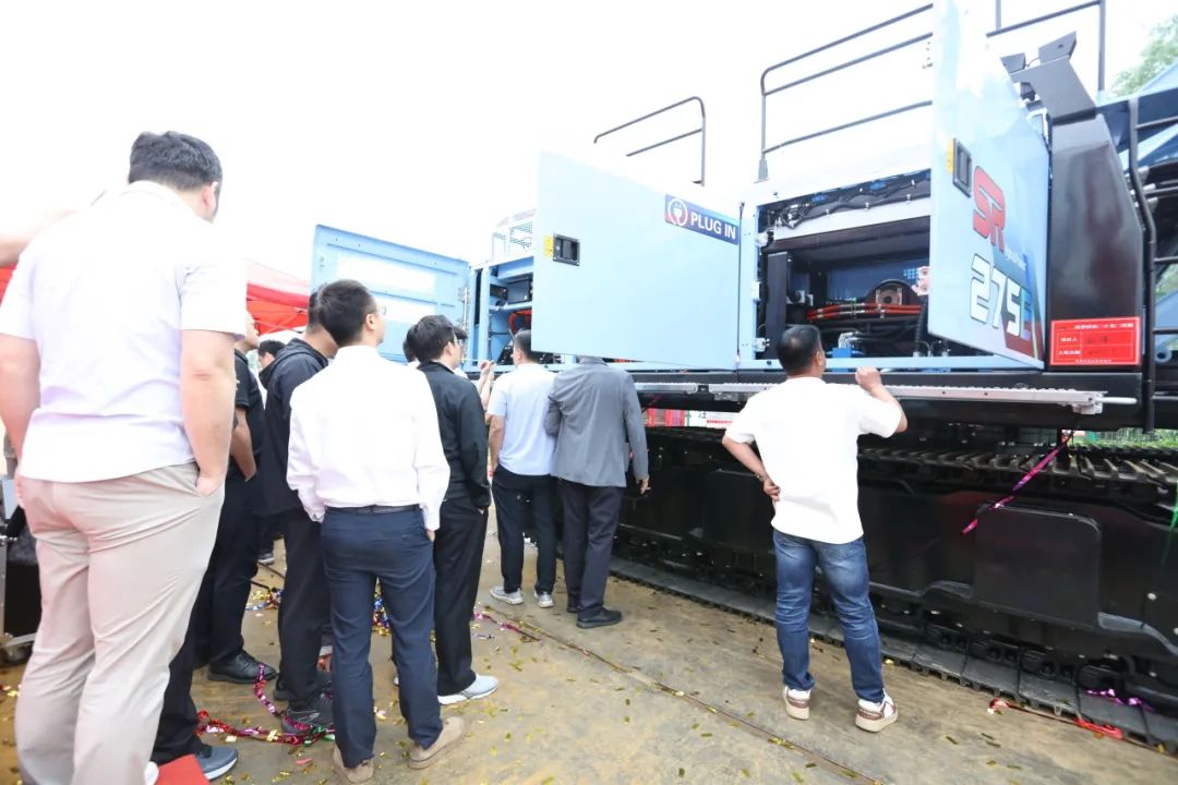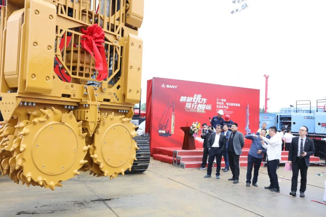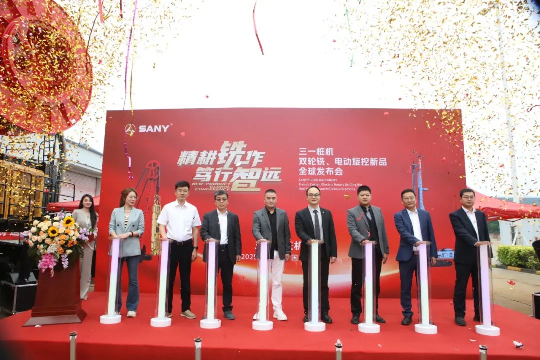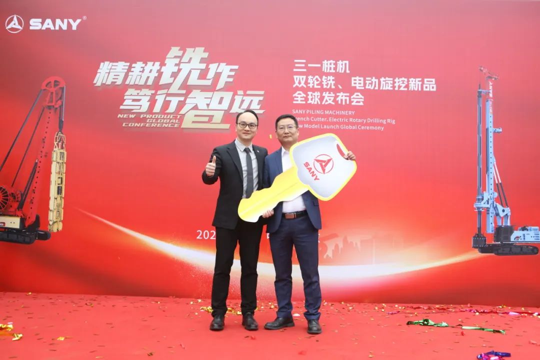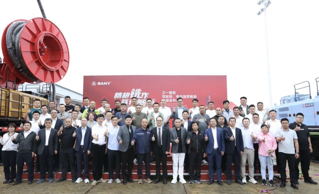 三一樁機(jī)公司領(lǐng)導(dǎo)與客戶代表共同按下啟動(dòng)按鈕,SDC125雙輪銑和SR275E電動(dòng)旋挖全球新品正式發(fā)布!現(xiàn)場(chǎng)彩帶飛揚(yáng)、掌聲雷動(dòng)。