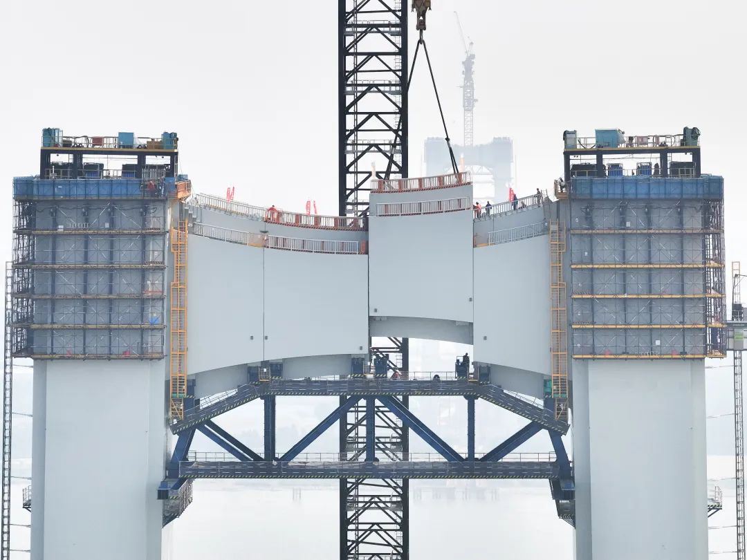 據(jù)了解,張靖皋長江大橋南航道橋主塔是大橋唯一一座江中主塔,建成后將成為世界最高懸索橋索塔。橫梁作為塔柱之間的支撐結構,其安裝精度直接影響到塔柱向上攀升的傾斜度和穩(wěn)定性,而中橫梁施工是橋塔的關鍵工程。此次安裝的中橫梁長34.4米,根部高19.2米,由4個節(jié)段構成,總重約1000噸,其節(jié)段重量大、起重吊裝難度高、焊接精度要求高。