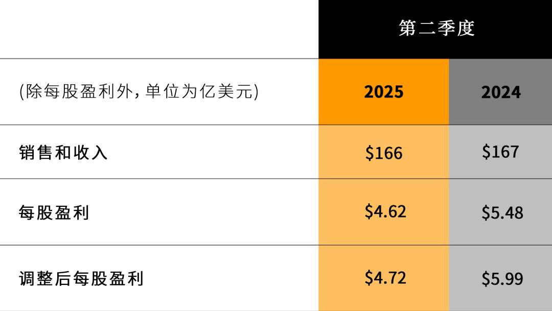 2025年第二季度營業(yè)利潤(rùn)率為17.3%,而2024年第二季度為20.9%。2025年第二季度調(diào)整后營業(yè)利潤(rùn)率為17.6%,而2024年第二季度為22.4%。2025年第二季度每股盈利為4.62美元,而2024年第二季度每股盈利為5.48美元。2025年第二季度調(diào)整后每股盈利為4.72美元,而2024年第二季度調(diào)整后每股盈利為5.99美元。2025年第二季度和2024年第二季度,調(diào)整后營業(yè)利潤(rùn)率和調(diào)整后每股盈利均不包括重組成本。