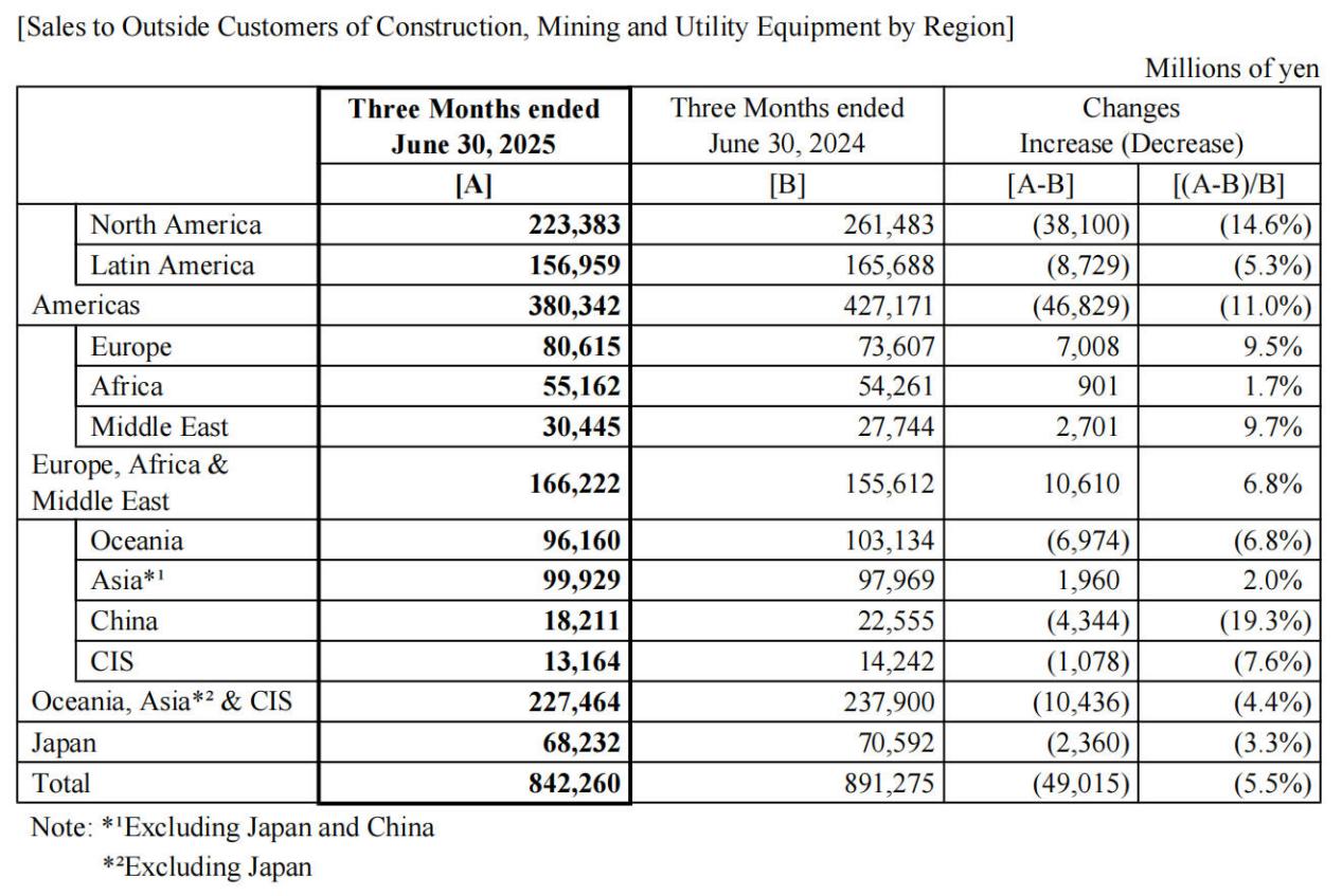 2025年4-6月小松不同地區(qū)業(yè)績(jī)情況 單位:十億日元