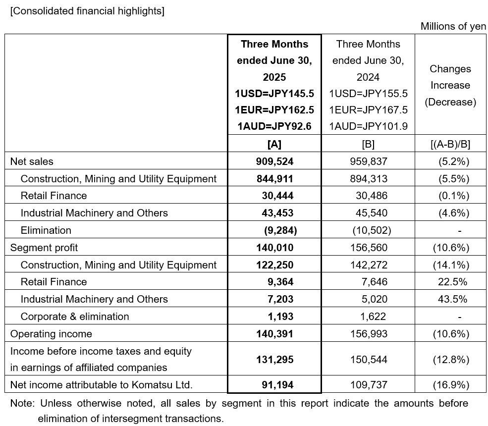 小松公布2025年二季度業(yè)績(jī):凈銷售額9095億日元同比下降5.2% 中國(guó)市場(chǎng)下降19.3%