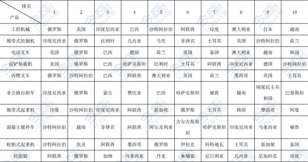 表1  2025年1-9月主要工程機(jī)械產(chǎn)品出口金額排名前十位國家和地區(qū)