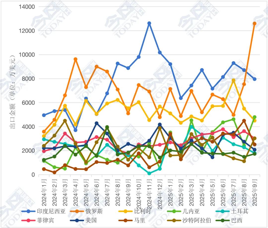 2025年1—9月我國挖掘機(jī)累計(jì)出口總額達(dá)76.36億美元,相較于2024年同期的60.14億美元,增長26.96%,增速較1—8月增長1.8個(gè)百分點(diǎn)。對印度尼西亞、俄羅斯和比利時(shí)出口位列前三。我國挖掘機(jī)出口月度走勢具體情況如圖2所示。