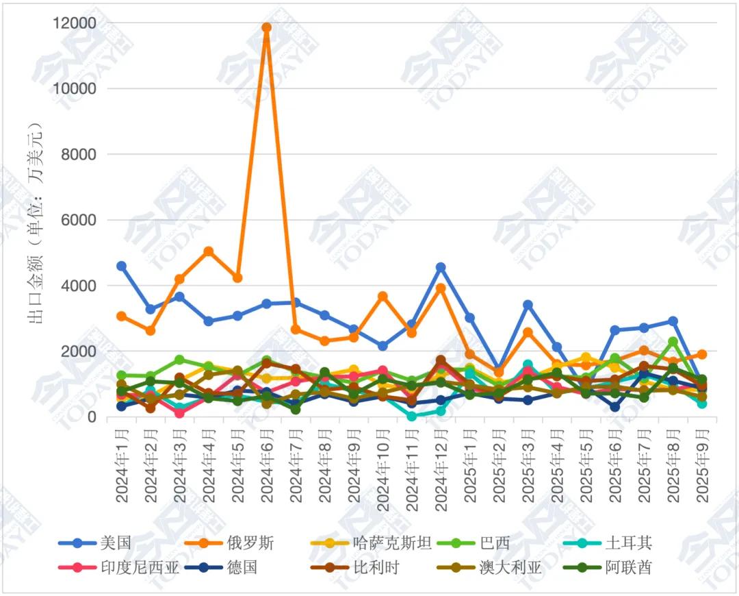 2025年1—9月,我國裝載機(jī)累計(jì)出口總額達(dá)28.01億美元,相較于2024年同期25.84億美元,同比增長8.39%,增速較1—8月增長0.8個(gè)百分點(diǎn)。對美國、俄羅斯和巴西出口位列前三。我國裝載機(jī)出口月度走勢具體情況如圖4所示。