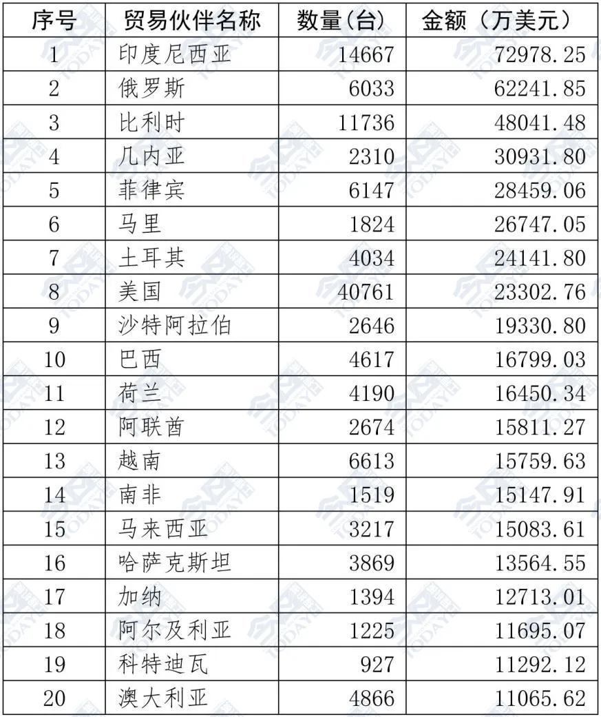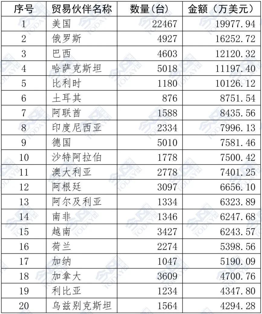 表2  2025年1—9月挖掘機(jī)出口額排名前二十位國家和地區(qū)