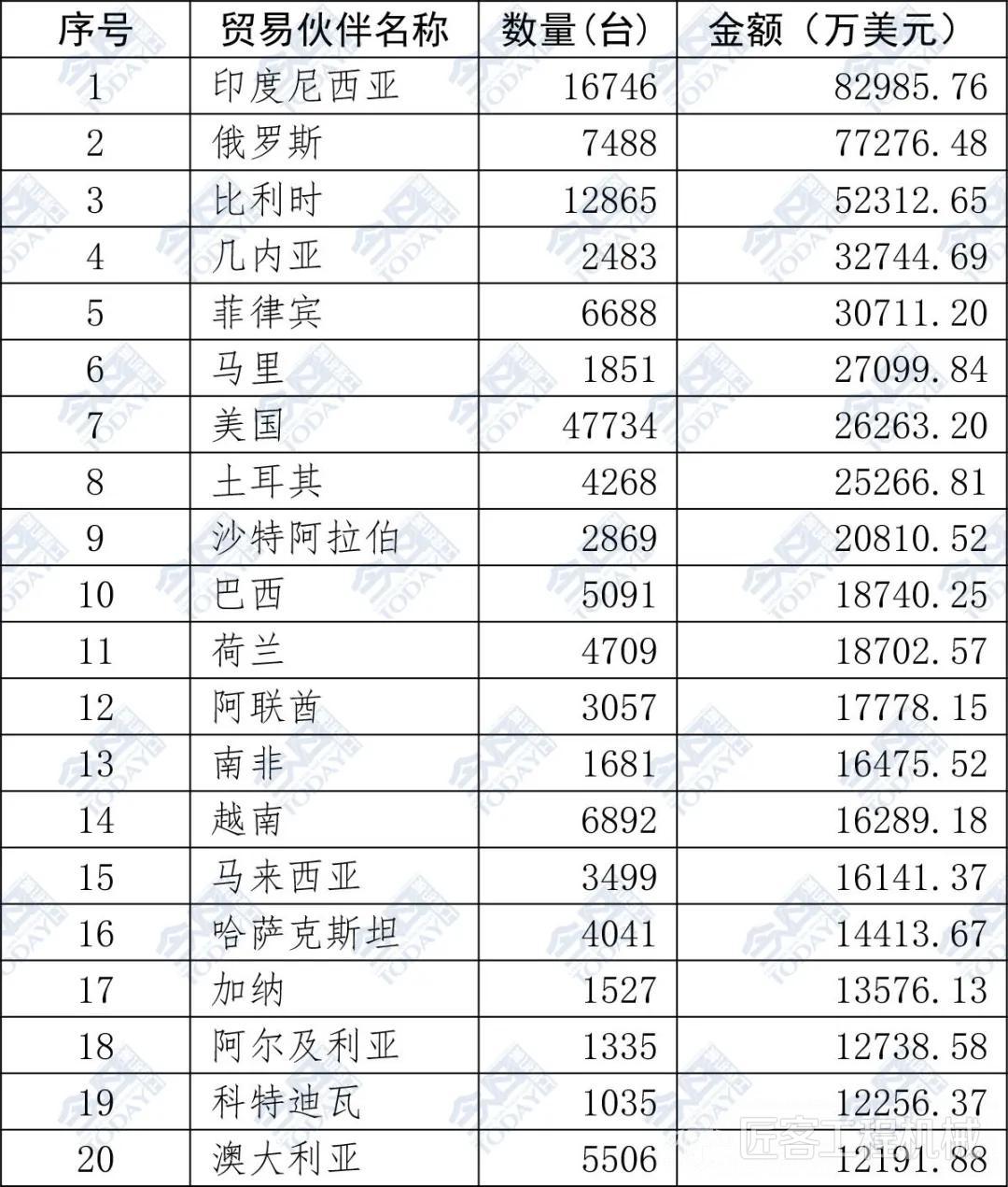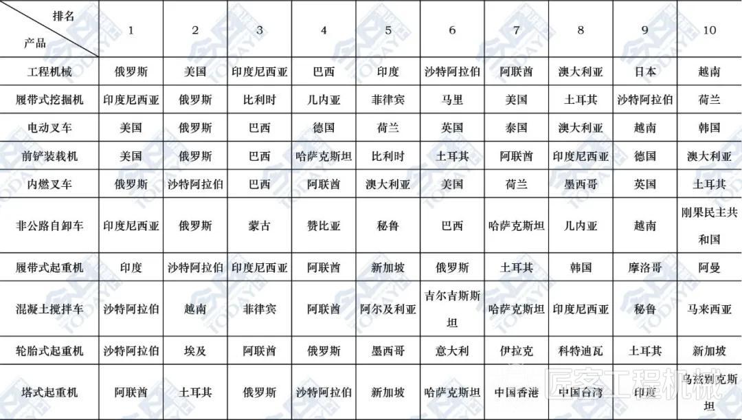 從2025年1—10月主要工程機械產(chǎn)品進出口貿(mào)易情況來看,對俄羅斯、美國、印度尼西亞出口金額排名位列前三。