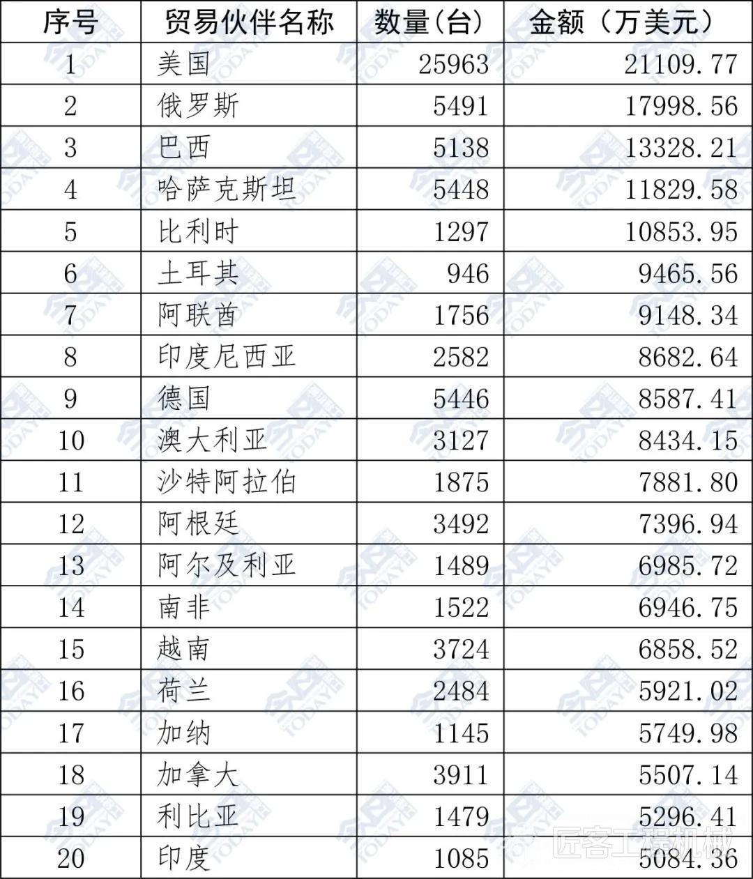 表2  2025年1—10月挖掘機出口額排名前二十位國家和地區(qū)