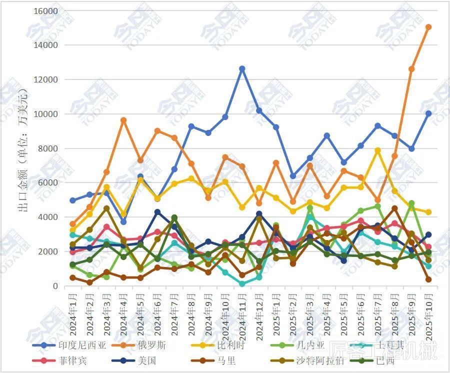 從環(huán)比情況來看2025年10月挖掘機出口情況,在出口額前十的國家中,僅印度尼西亞、俄羅斯、美國、巴西四國實現(xiàn)環(huán)比增長。其中美國增幅超40%;對俄羅斯出口額連續(xù)兩個月大幅增長,并于10月首次突破1.5億美元,創(chuàng)近兩年挖掘機單月出口國別最高紀錄;對印度尼西亞出口額則突破1億美元,創(chuàng)該國2025年內(nèi)月度出口新高。我國挖掘機出口額走勢具體情況詳見圖3。