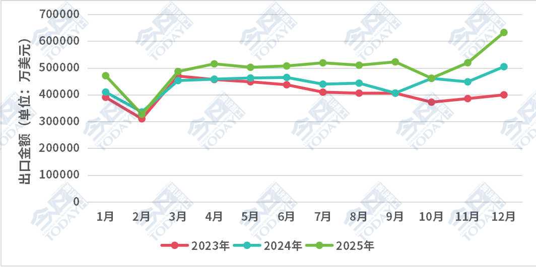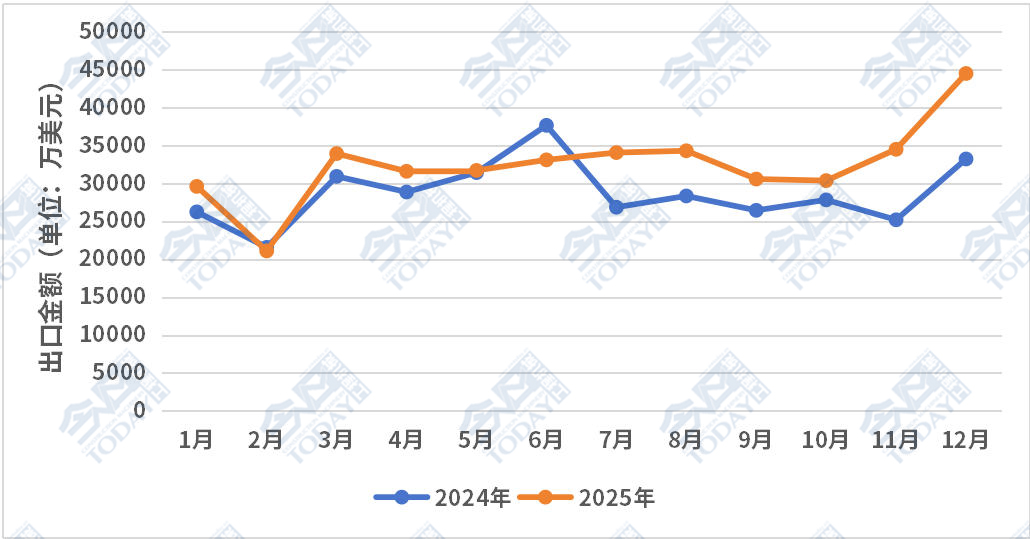 從累計(jì)出口額前十的國(guó)家來(lái)看,馬里雖然在2025年全年整體出口額中僅排在第七,但是其在12月表現(xiàn)十分亮眼,環(huán)比大幅增長(zhǎng)269%,擺脫了此前數(shù)月的溫和態(tài)勢(shì)。同時(shí)巴西同比表現(xiàn)也十分突出,與上年同期相比增長(zhǎng)182.85%。