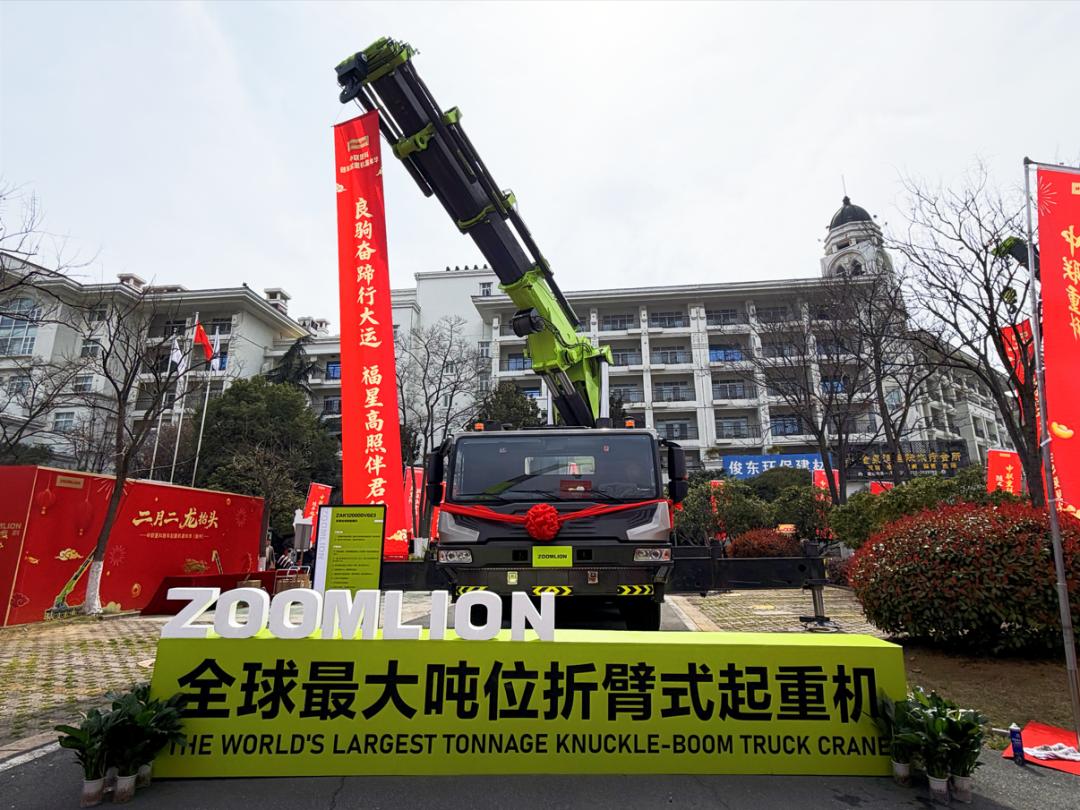 活動現(xiàn)場,8至16噸全系列直臂隨車起重機(jī)整齊列陣、吊臂擎天。這些產(chǎn)品憑借強(qiáng)悍的性能表現(xiàn),可充分滿足全球客戶多樣化的工況作業(yè)需求。尤為吸睛的是,全球最大噸位折臂式起重機(jī)也在活動中驚艷亮相。該產(chǎn)品搭載行業(yè)首創(chuàng)的五橋全地面底盤,支持6種轉(zhuǎn)向模式,起重力矩與最大推舉能力均穩(wěn)居行業(yè)首位,可精準(zhǔn)適配低矮廠房內(nèi)大型設(shè)備的搬運(yùn)與安裝場景,破解特殊場景作業(yè)難題。
