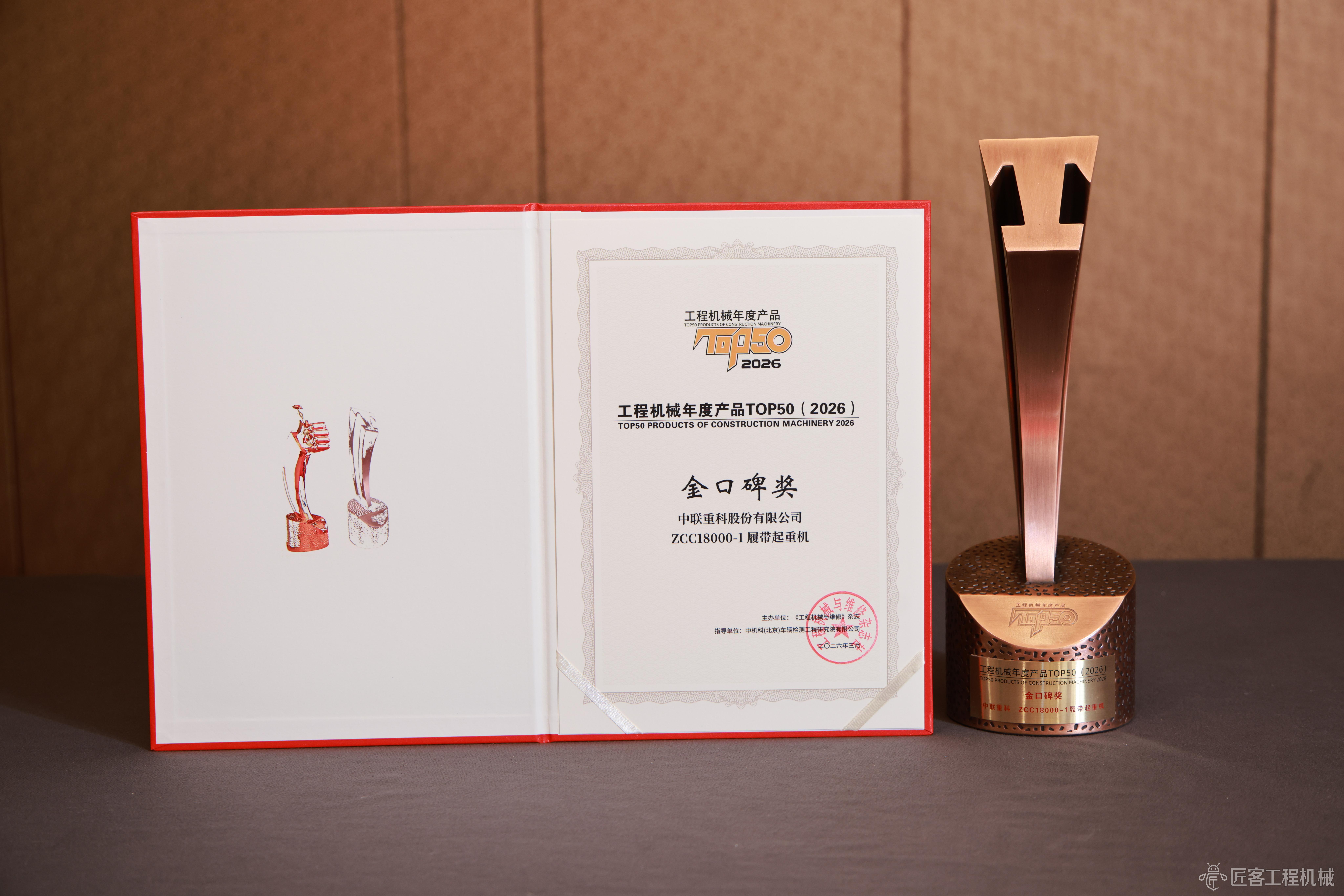 2026CM TOP50丨中聯(lián)重科ZCC18000-1履帶起重機(jī)榮獲2026工程機(jī)械年度產(chǎn)品金口碑獎