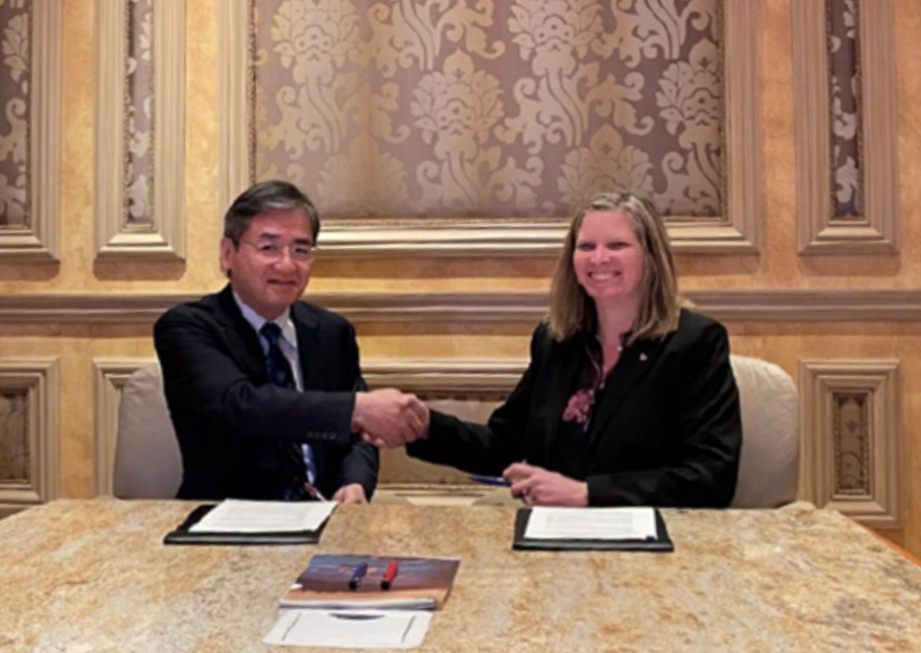 康明斯董事長(zhǎng)兼CEO Jennifer Rumsey(右)與小松總裁兼CEO Takuya Imayoshi(左)在簽約儀式上握手
